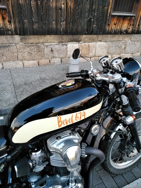 ハンドルはセパハン登録、ロングタンクにベベル674のロゴにもこだわりが。ちなみにステンレス製のバッテリーケースは伏見稲荷の鳥居を手掛ける職人さんの手作り。マフラーは滋賀県の板金職人さんに特注で製作してもらったとのこと。職人さんの協力なしには仕上げることができない逸品。人脈の広さを感じます。